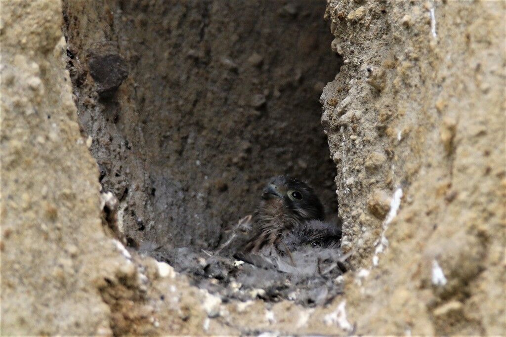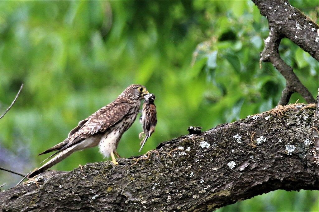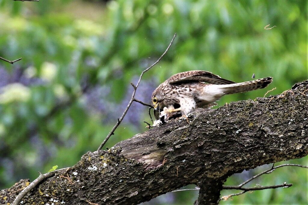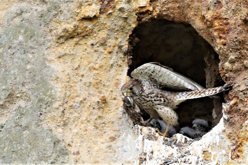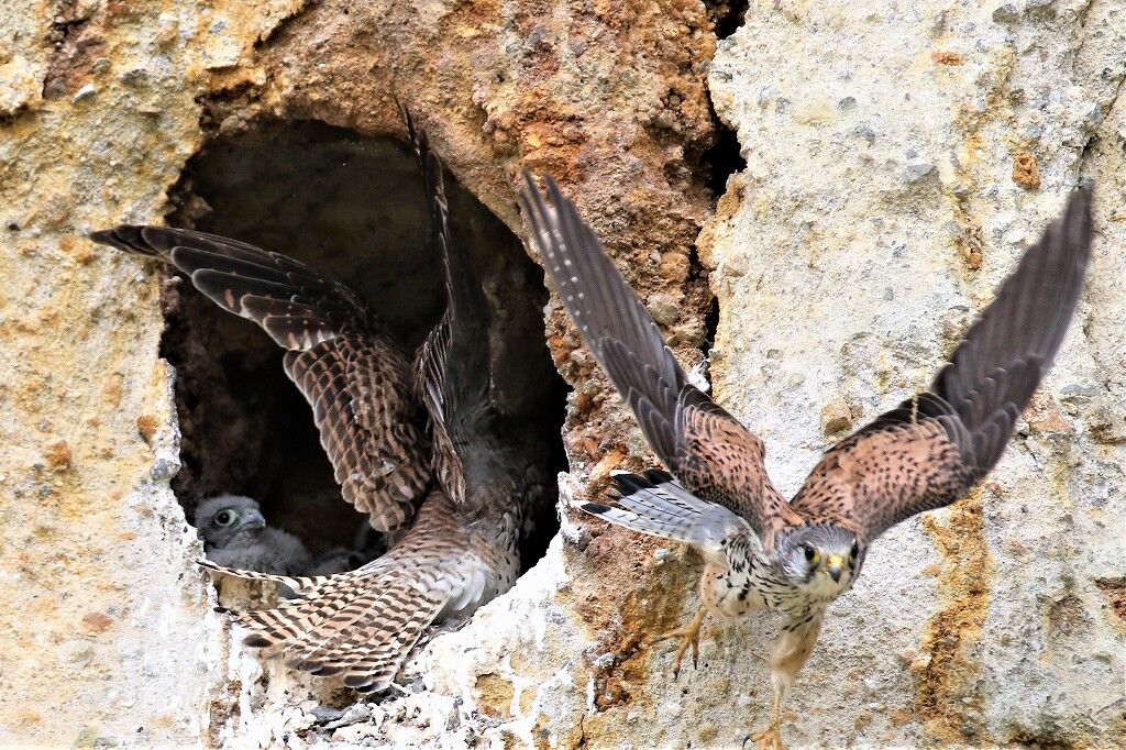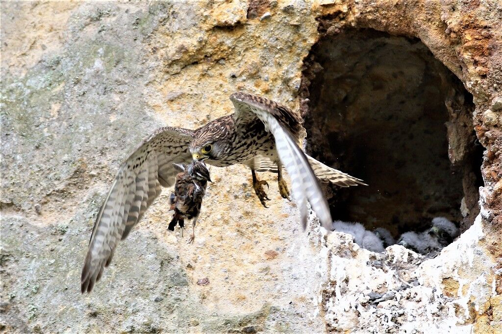 母は父親が投げ込んだ野ネズミを食いちぎって雛に与える