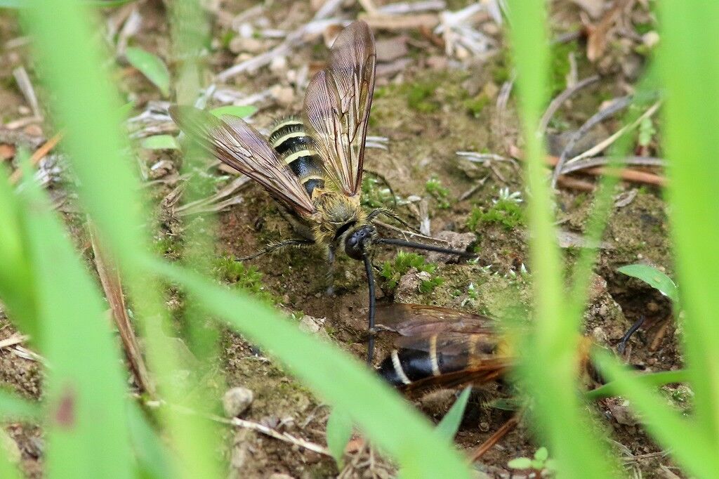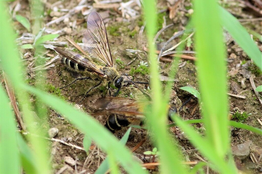 メスはコガネムシの幼虫に毒針を挿し仮死状態にして、その幼虫に卵を産みます。