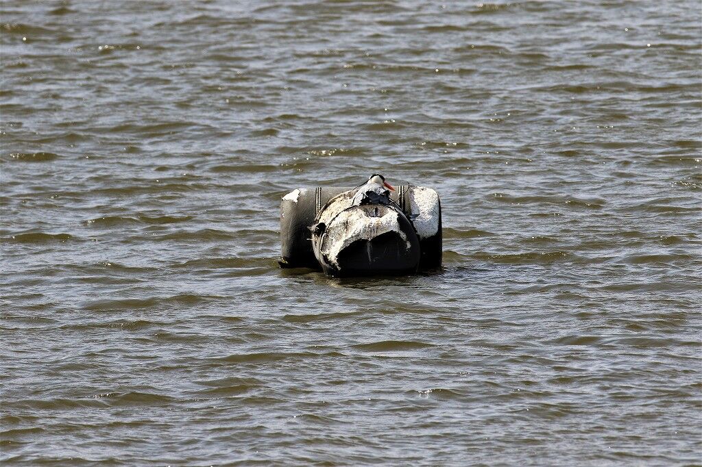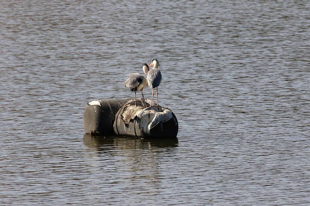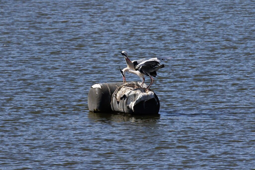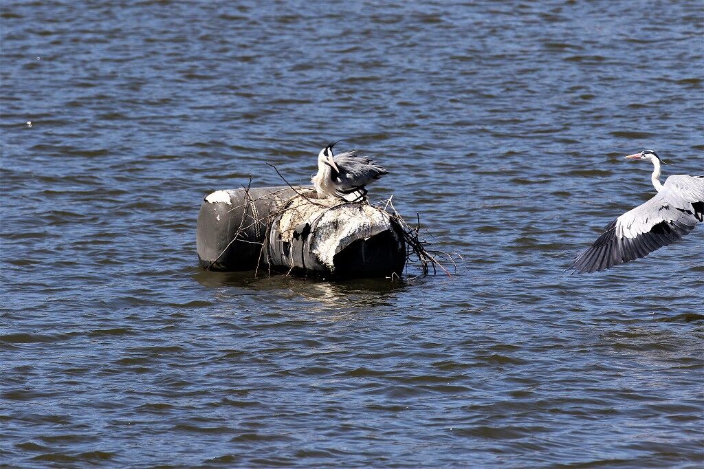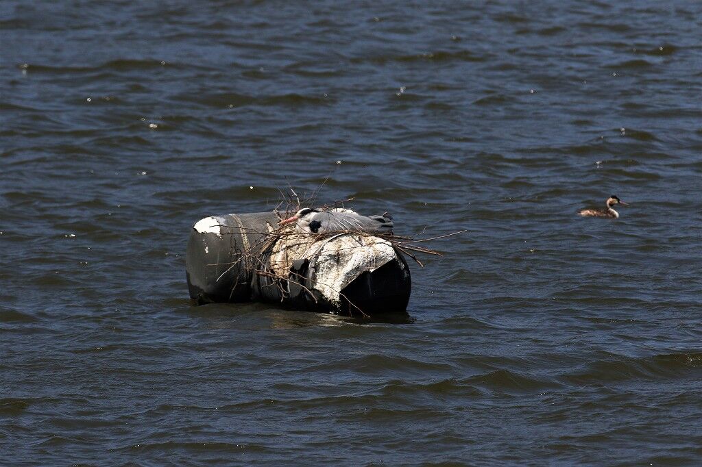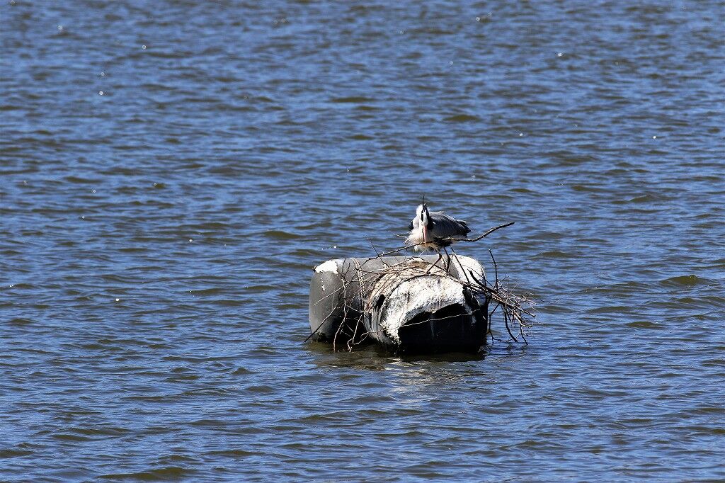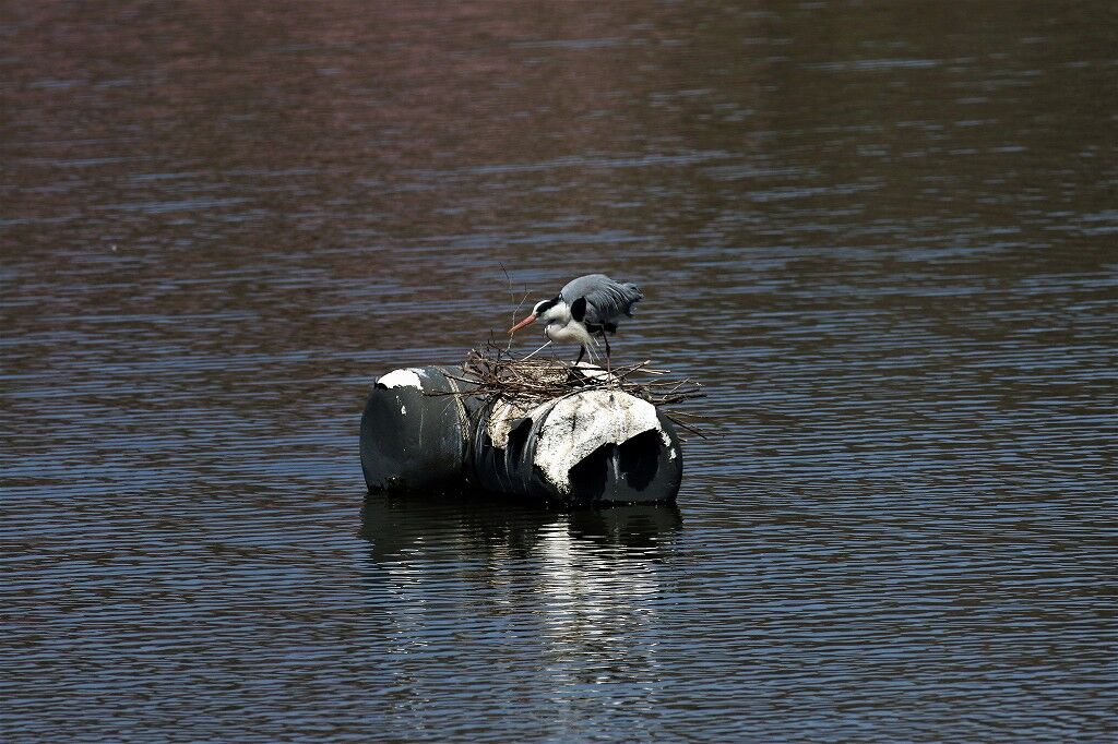 強風で飛ばされた巣材が水面に浮いています