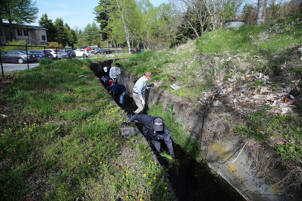 一般区民の方も防火用水の手入れという認識で参加しています今年は水路への昇降と、水路を渡る時の安全を確保するため足場板を用意しました。